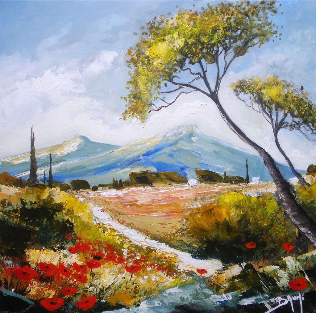 Tags : Peinture figurative - Peinture paysage de Provence - Tableau provençal - Peinture champ de coquelicots - Peinture au couteau